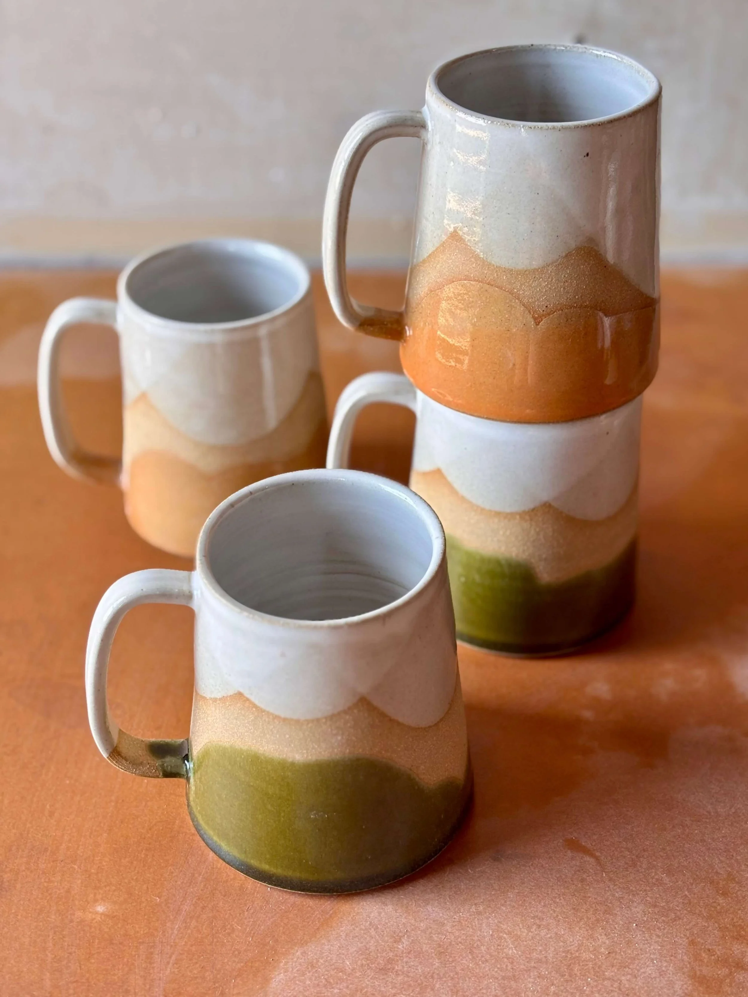 These wheel thrown ceramic wares are inspired by soft mountain lines and nature's colors. Handmade in small batches with special attention to the size and pitch of the handles, this mug is exceptionally comfortable to hold.